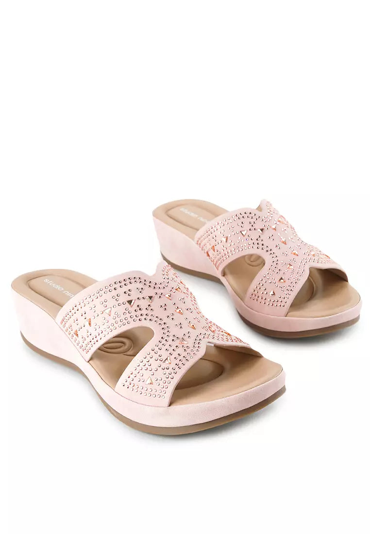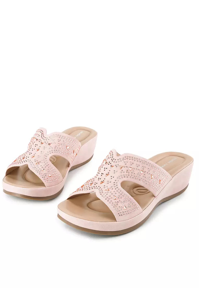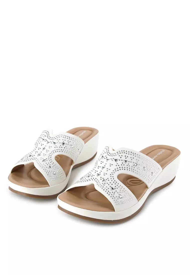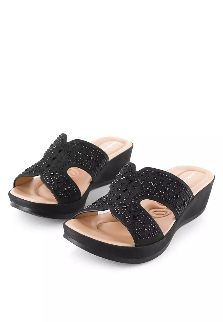- Sandal wedges warna solid dengan detail embellishment berkesan klasik